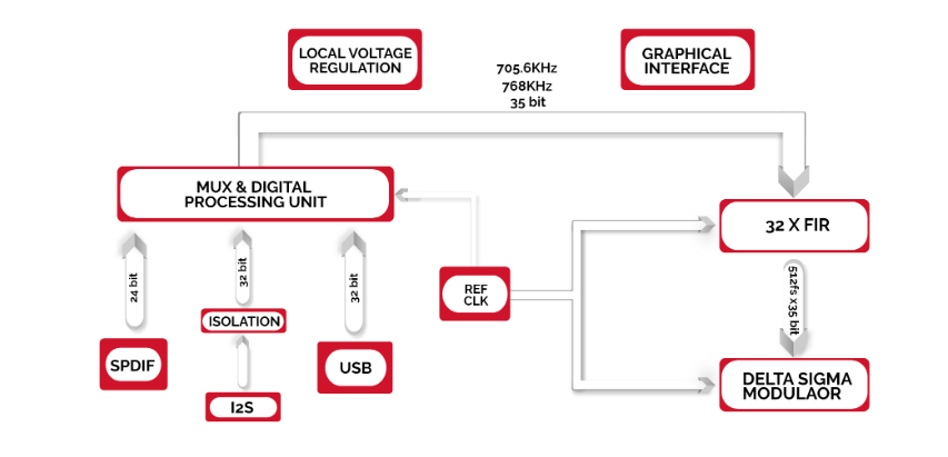 Attaining a high performance 1-bit converter requires extensive digital processing. In order to keep a pristine sound quality, the processing must be done in a resolution higher than the music itself. Using 80 DSP cores running at 200 MHz and 68-bit processing, VOX has enough computing power to preserve the transparency required by the most demanding audiophile.